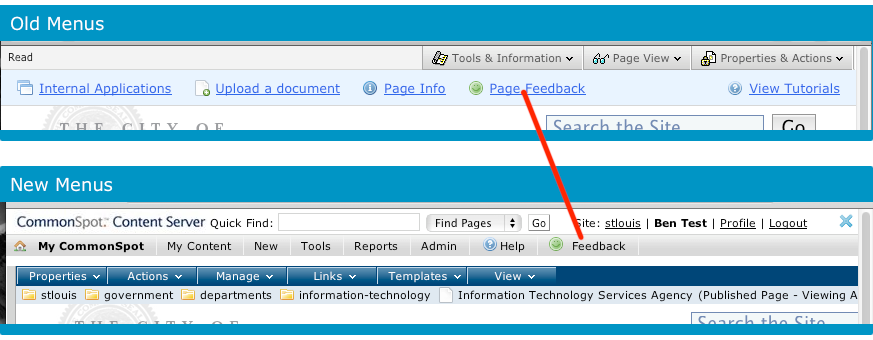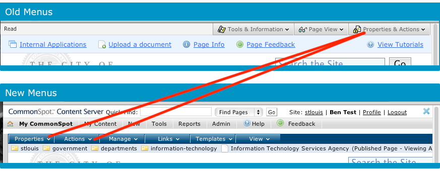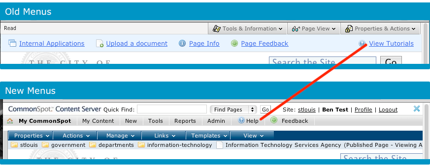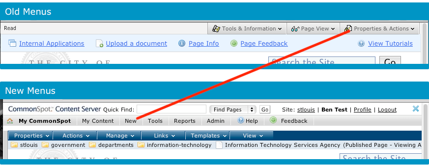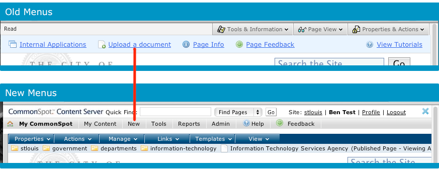 Comparing basic menu options between CommonSpot 5 and CommonSpot 7.